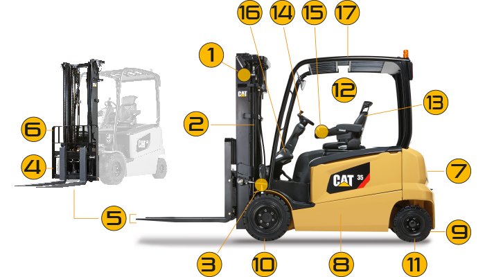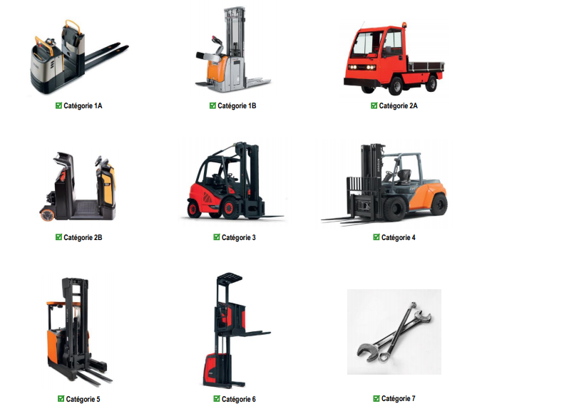 Véhicules motorisés servant à lever, transporter et déposer des charges. Contrôle des fourches, du mât, des freins, pneus, avertisseurs et de la stabilité.